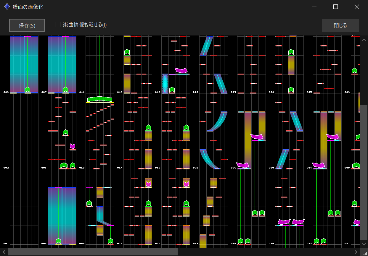 便利機能譜面の画像化On this page譜面の画像化譜面保管所風の画像を作ることができます。方法メニューの ファイル > 譜面を画像に変換... を選択します。より便利な使い方挿入 メニュー にある 改行マーカー を活用することで、任意の小節で改行して出力することができます。